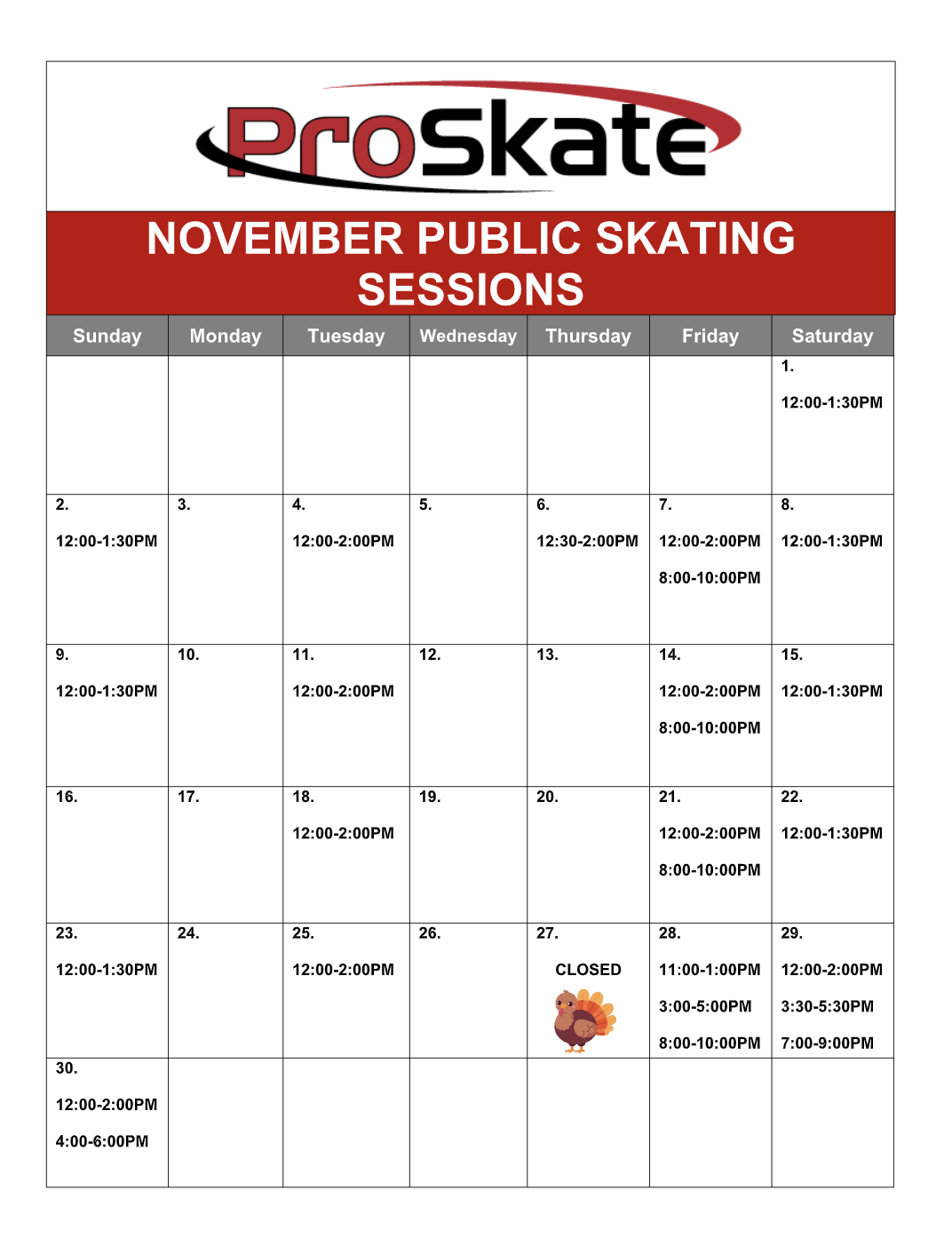 *Times vary. Please check the calendar below for most up to date public skating schedule.*